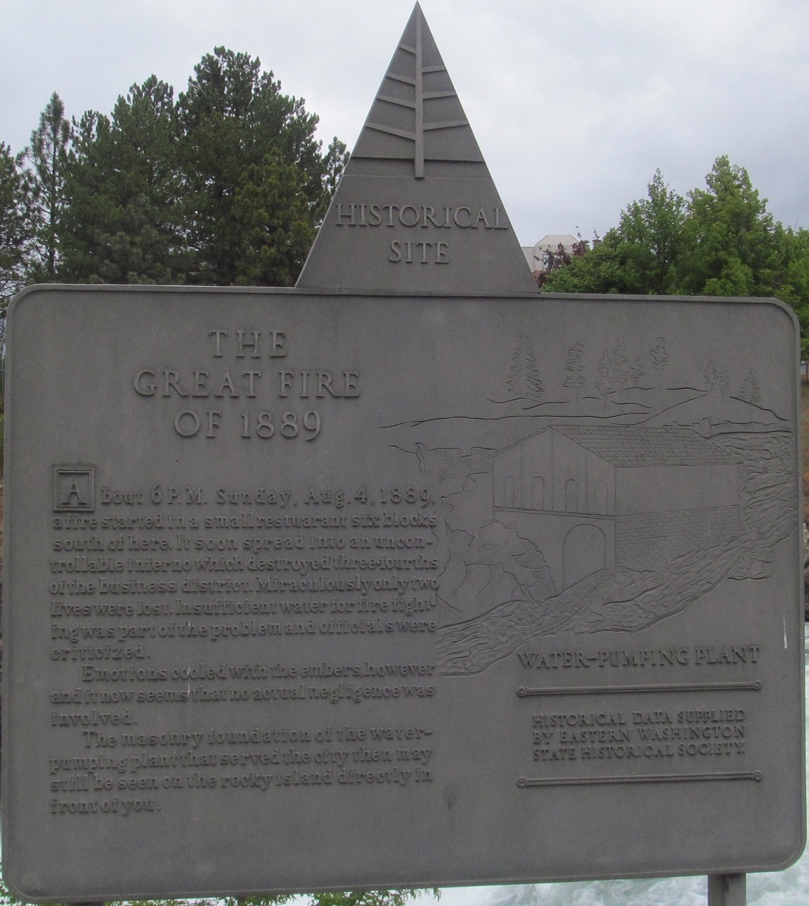 From the Havermale Island side of Howard Street, these photos look back across the center Spokane River channel at Canada Island and this goat statue. I have no idea why this statue is here, but as strange as it seems to commission a random goat sculpture along the river, there's an even stranger goat statue to be found, one that actually eats garbage. That one, which I never saw, played a recorded voice when it sensed a visitor approaching to request that person's garbage. The goat would then suck the garbage into its mouth. The strangest part is that this worked for any length of time during the World's Fair.